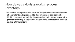 The amount of ending work in process must be derived as part of the period-end closing process and is also useful for tracking the volume of production activity. How to Calculate Work in Progress Formula. WIP Inventory Example 2.