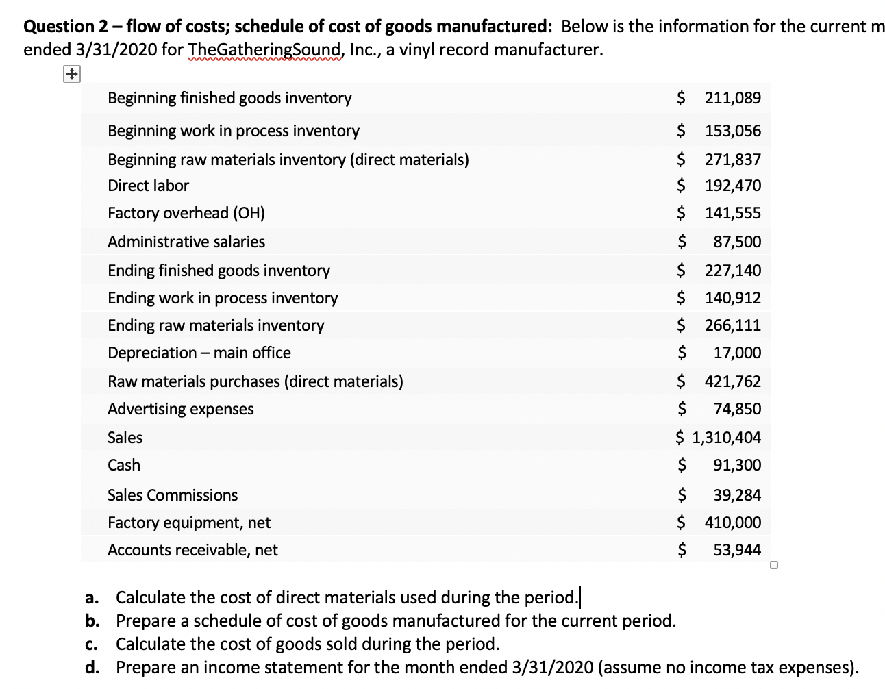 Solved Question 2 Flow Of Costs Schedule Of Cost Of Goods Chegg Com